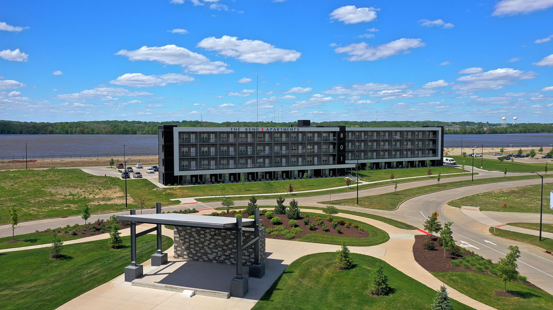 The Bend Apartments is luxury apartment complex located in East Moline, IL. Studio apartments feature a washer and dryer in each unit, luxury vinyl plank floors, quartz countertops, Stainless steel appliances and private balconies overlooking Mississippi River.